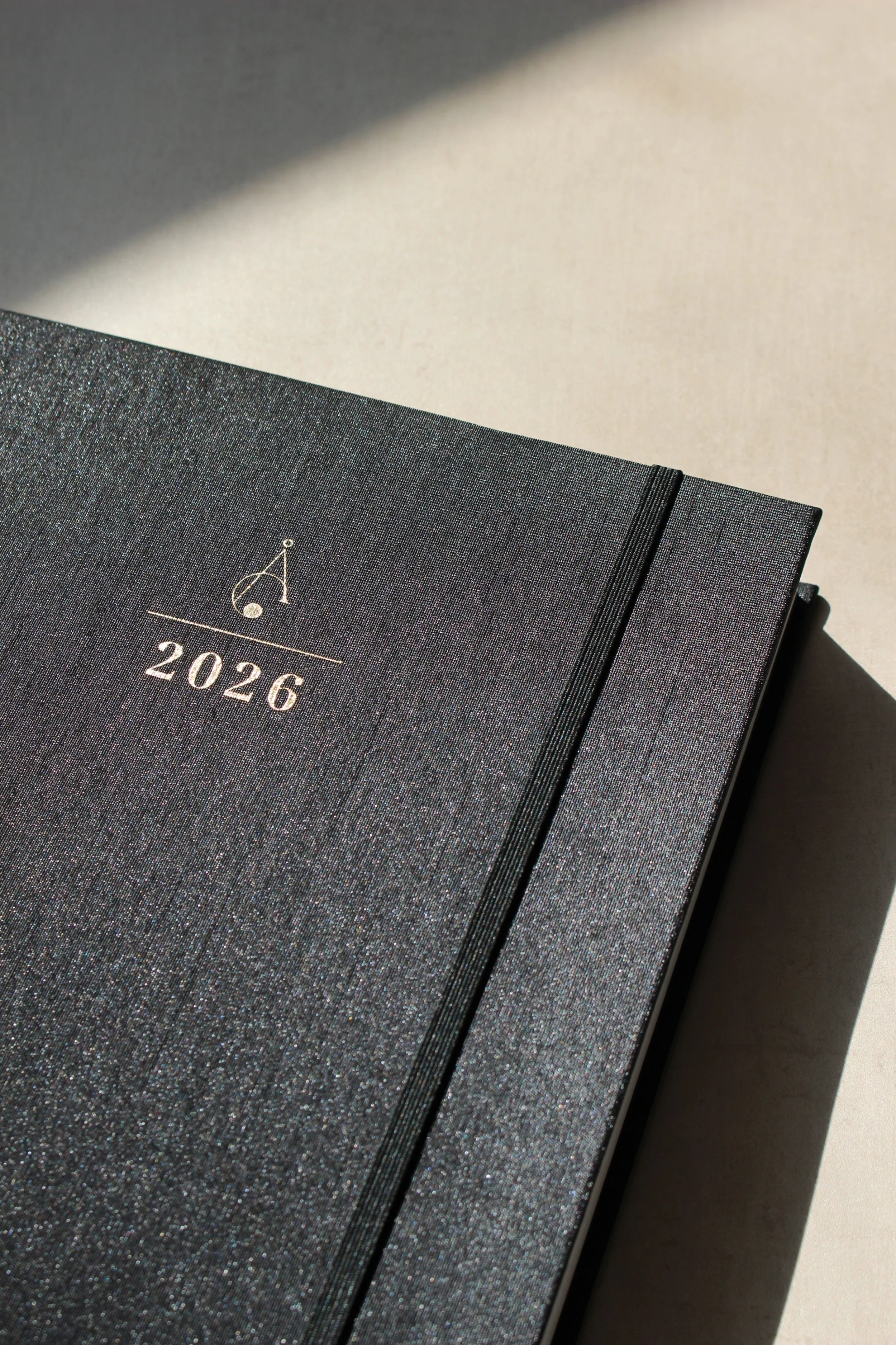 Traditionally reserved for couture gowns and ceremonial attire, silk infused taffeta is celebrated for its crisp structure and light-catching surface—qualities rarely seen in the stationery world. Ethically woven without harm to silkworms and produced in small batches, our 2026 cover reveals delicate variations in grain, ensuring every cover is inherently unique. The result is a tactile reminder that no two paths are alike. Just as the stars trace a different map for each soul, this artisan textile reflects your singular journey through the year ahead.